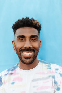 Smiling Hispanic man wearing eyeglasses looking away while standing on rooftop of building in city