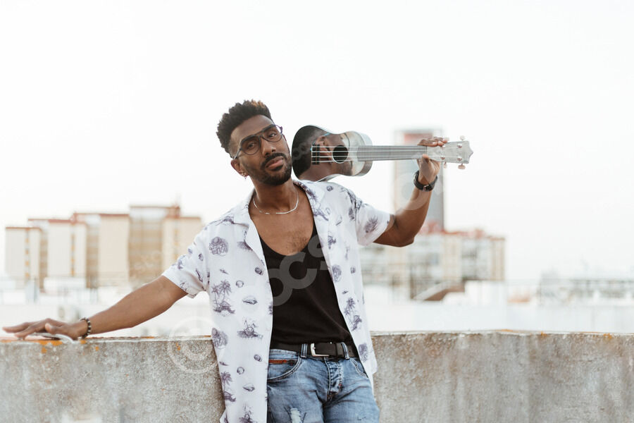 Hispanic man wearing eyeglasses with ukulele on shoulder standing on balcony of building in city
