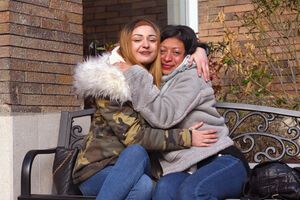 Hispanic and caucasian female friends wearing jackets sitting on bench in park during winter
