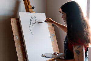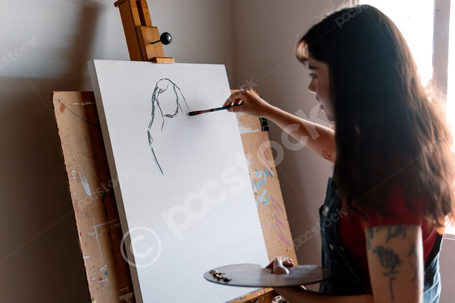 Hispanic female artist wearing red shirt and blue overalls painting on canvas while standing in her home studio