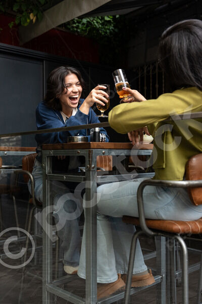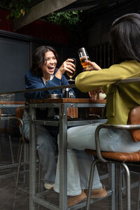 Smiling Hispanic woman toasting glass of beer with girlfriend while sitting together at table in restaurant