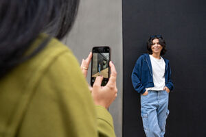 Hispanic woman standing near girlfriend taking picture of him on smartphone while standing with hands in pocket outdoors during daytime