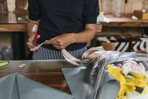 Middle-aged Asian female florist using scissors cutting ribbon on bouquet while standing at table in flower shop