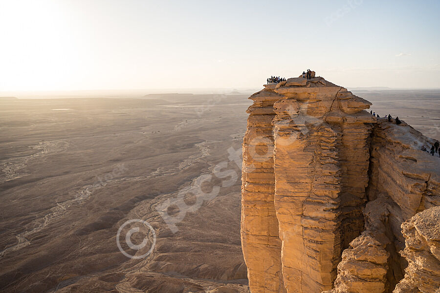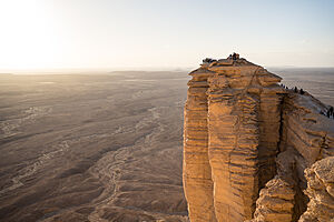 Group of anonymous travelers contemplating colorful sundown while visiting the Edge of the World in Saudi Arabia
