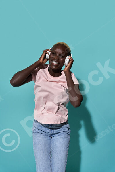 Black woman with hands on headphones enjoying music standing against blue wall