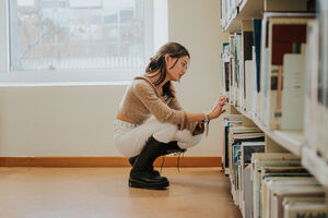 Asian female crouching on floor while looking for books in university library