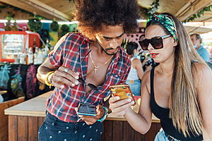 African American man looking at female customer's mobile phone near outdoor beach bar