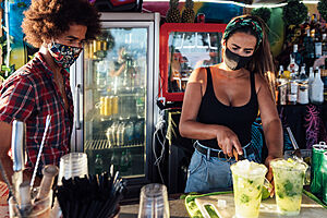 Woman holding cocktail drink chatting with African American bartender in face mask