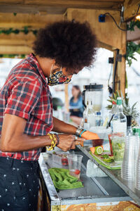 African American barman preparing cocktail drinks for White female client in outdoor bar