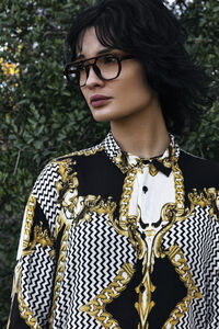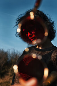 Middle Eastern woman with curly hair wearing sunglasses standing in forest at sunset