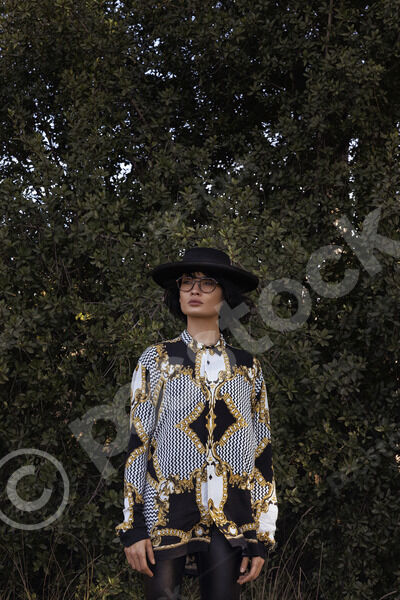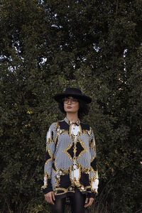 Middle Eastern woman wearing hat and eyeglasses looking away standing in forest during daytime