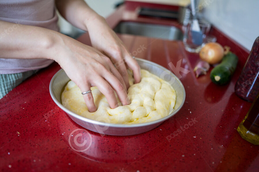 Chinese woman preparing homemade focaccia while standing at kitchen counter at home