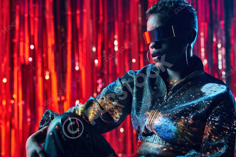 Black female in cyber glasses looking away standing against red tinsel curtains