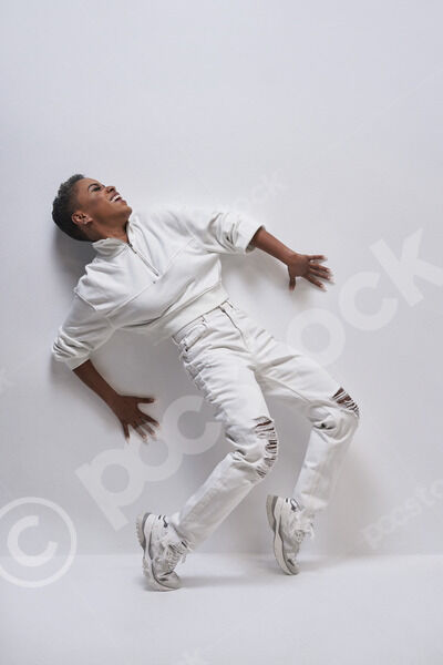 Black female leaning on hand against disco ball sitting against tinsel curtains