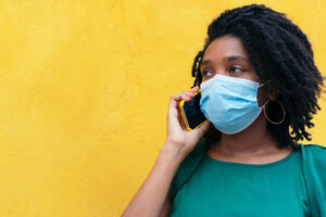 Black businessman with mask walking with luggage along crosswalk in the city