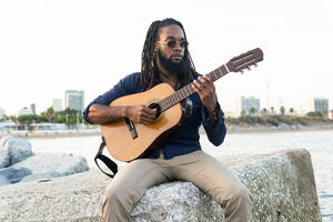 Black female leaning forward while sitting against purple wall indoors