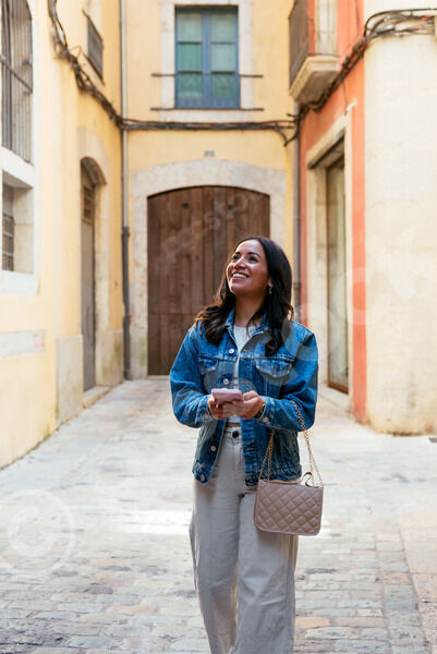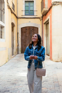 Smiling Black woman holding handbag using smartphone looking up standing near old building on street during daytime