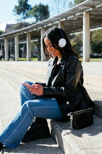 Smiling Black woman listening to music with headphones using smartphone sitting on outdoor stairs in park on sunny day