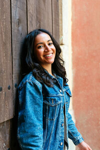 Smiling Black woman wearing denim jacket holding bag leaning on wooden wall on street during daytime