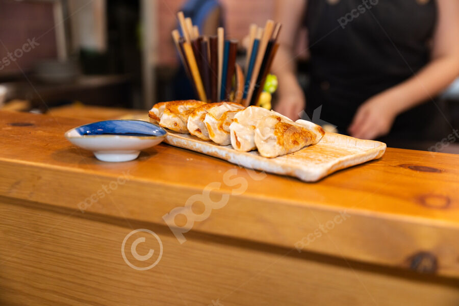Dumplings served on ceramic tray placed on wooden counter near Korean female chef standing in restaurant
