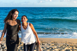 Hispanic lesbian couple holding hands and pulling each other standing outdoors during daytime