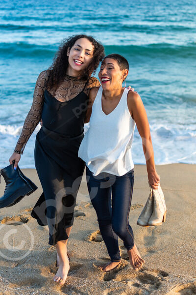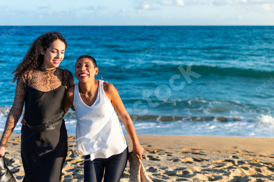 Hispanic lesbian couple holding their shoes hugging while walking on beach at sunset