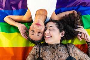 Hispanic lesbian couple looking at each other holding hands and raising rainbow flag while walking on sidewalk during daytime
