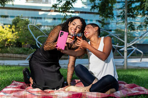 Hispanic lesbian couple taking selfies with smartphone standing with arms around each other in city during daytime