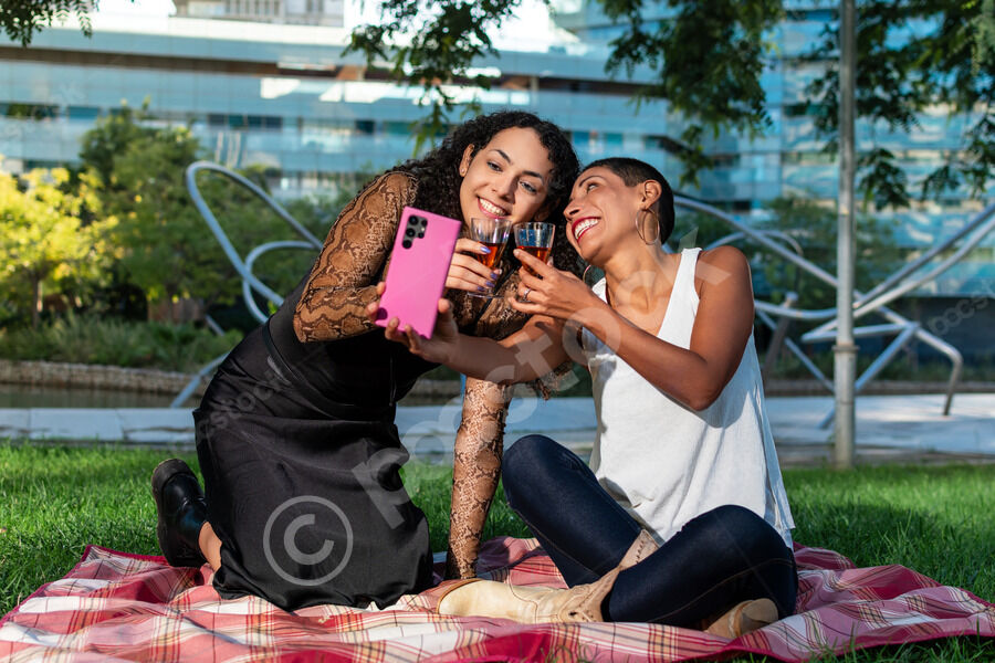 Hispanic lesbian couple taking selfie using smartphone while toasting glasses of wine sitting on blanket during picnic in park