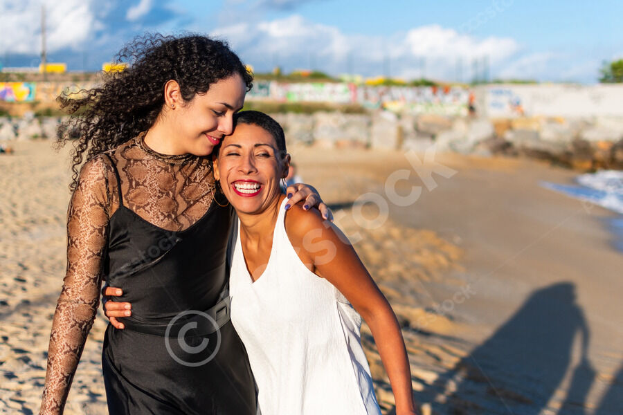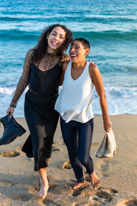 Hispanic lesbian couple holding their shoes hugging while walking on beach on sunny day