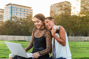 Hispanic lesbian woman leaning head on shoulder of girlfriend using laptop in park at sunset