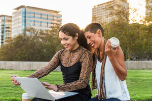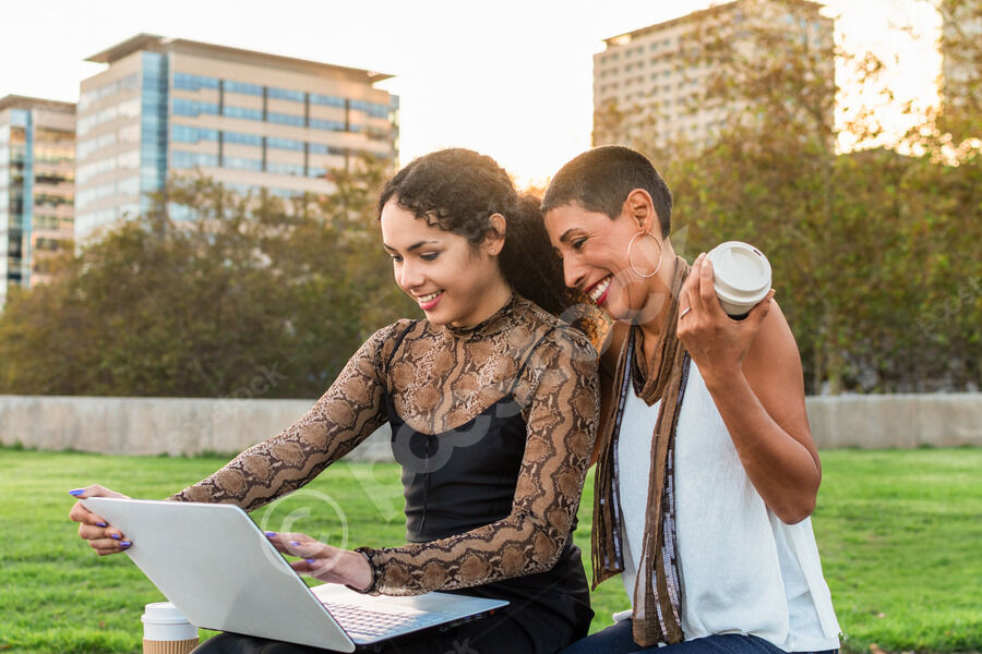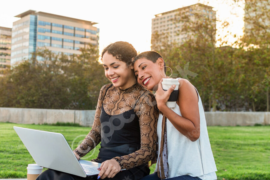 Hispanic lesbian couple using laptop together sitting on bench in park at sunset