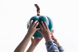 Serious Black woman with long green braids standing with crossed arms against blue wall on street