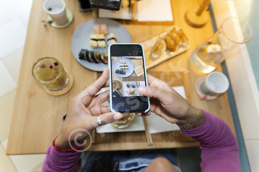 Hispanic woman using smartphone taking pictures of sushi rolls and dumplings while sitting at table in restaurant