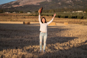 Hispanic woman with curly hair standing with hand on pocket and touching hair