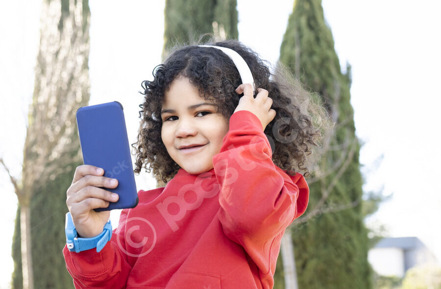 Hispanic kid with curly hair holding on headphones and cellphone smiling