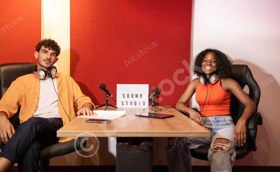 Smiling Black female and serious caucasian male sitting at desk with microphones and music sheets during podcast recording in the studio