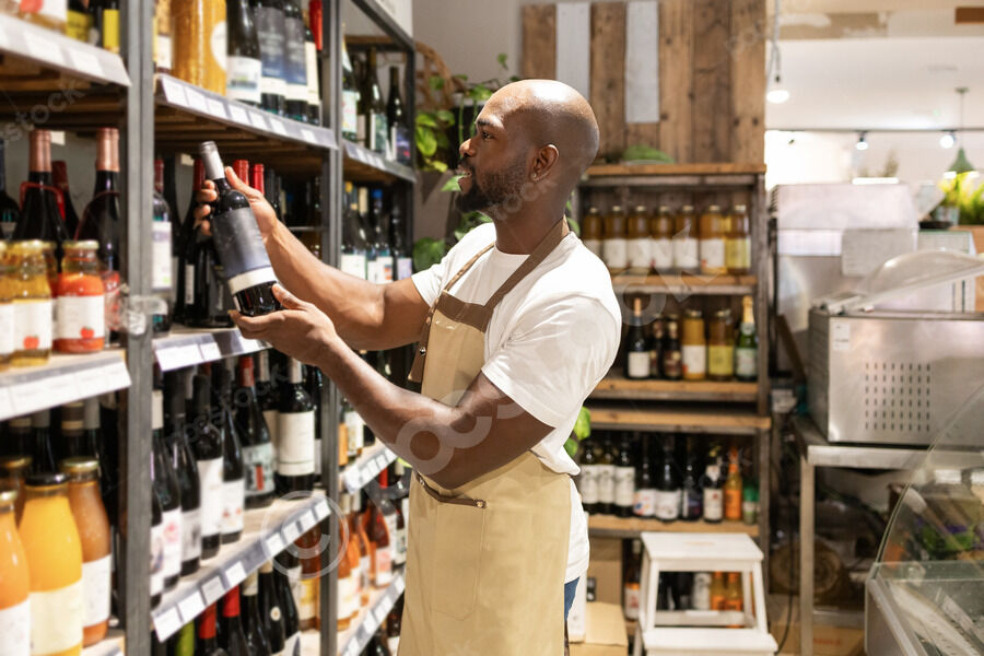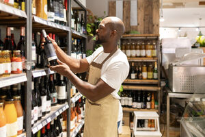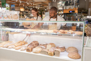 Hispanic male and caucasian female store employees wearing aprons using tablet together in supermarket