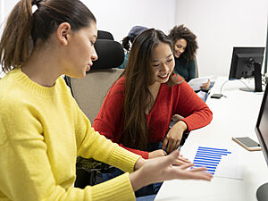 Group of business women in casual clothes sitting at computer desk discussing chart with results of marketing research on paper working together in modern coworking office