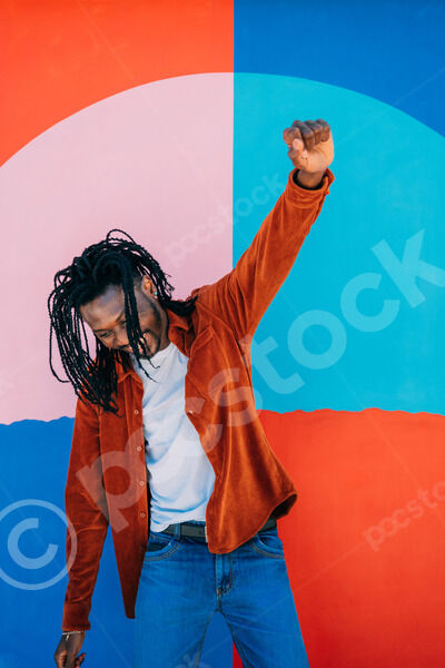 Black man with braids bowing his head raising closed fist against colorful wall outdoors