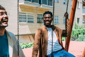 Black gay man sitting on swing looking at caucasian boyfriend in playground on sunny day