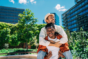 Black gay man giving piggyback ride to his caucasian boyfriend on city street on sunny day