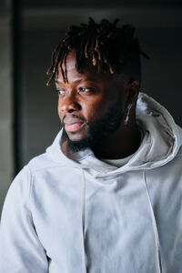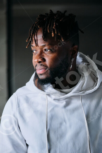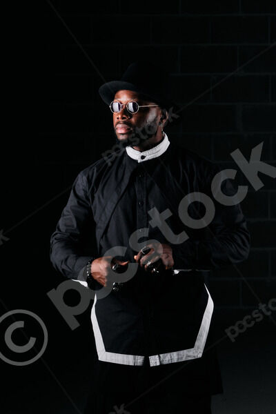 Black man in eyeglasses wearing hat looking away while standing with clasped hands against black background in dark room