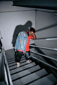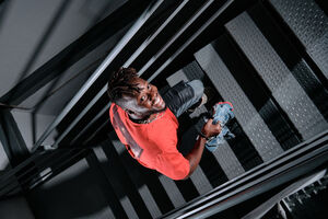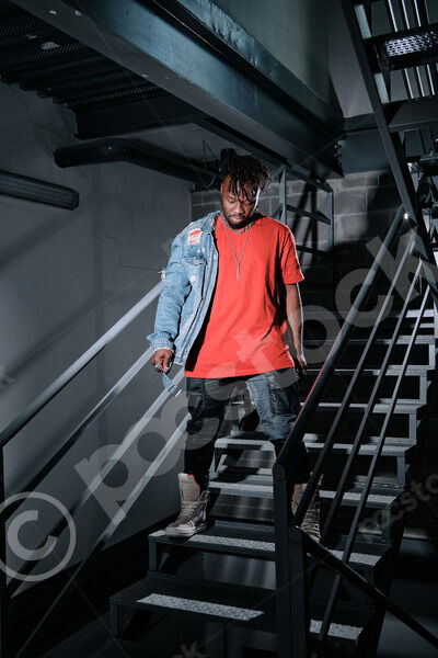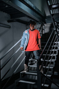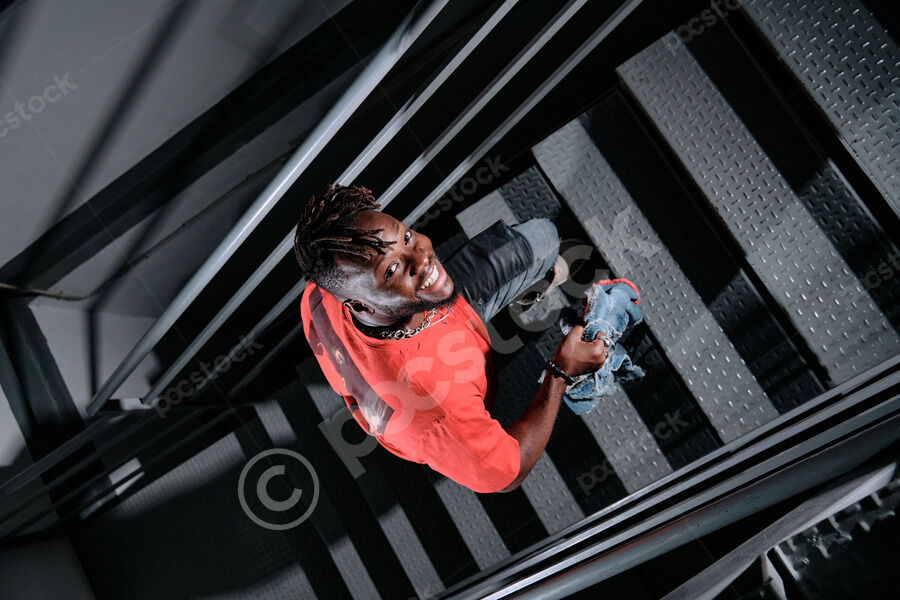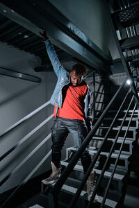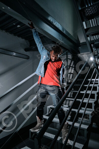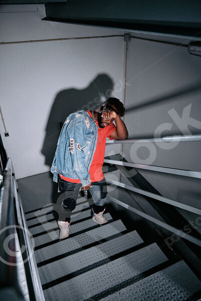 Black man leaning arm on metal railings while standing on stairs inside the dark building