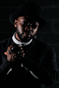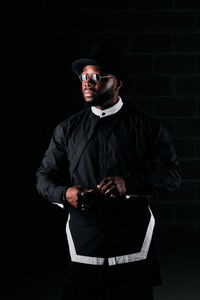 Black man in eyeglasses wearing hat outstretching arms while walking inside the dark building