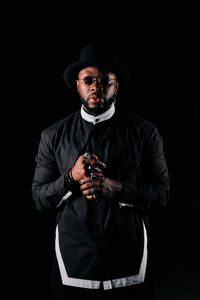Black man in eyeglasses wearing hat looking away while standing against black background in dark room