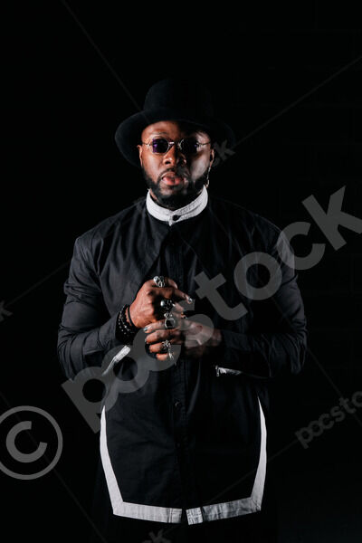 Black man in eyeglasses wearing hat outstretching fist with rings while standing in dark studio with neon lights