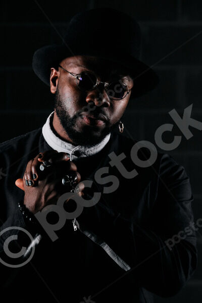 Black man in eyeglasses wearing hat standing with clasped hands against black background in dark studio