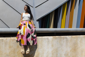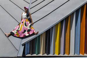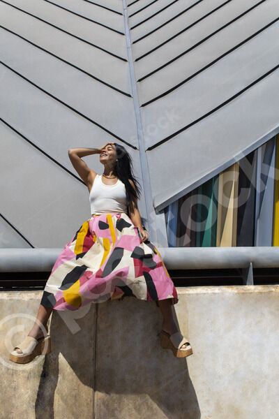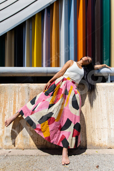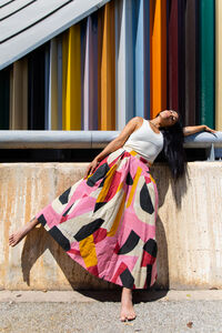 Hispanic woman wearing white tank top, floral long skirt, and pink cap lying on a slanted architectural structure with multi-colored, ribbed facade outside the building on sunny day