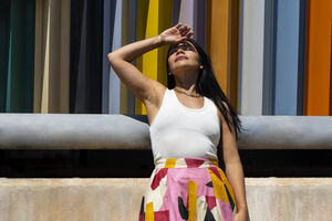 Hispanic woman wearing white tank top and floral long skirt leaning hand on her face standing with closed eyes outside a colorful building on sunny day